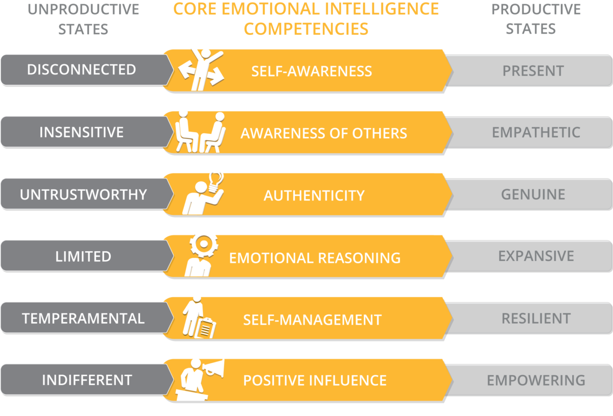The Genos Workplace Model of Emotional Intelligence comprises a set of six emotionally intelligent competencies that are specifically designed to enhance professional performance and workplace communication. The Genos model focuses on behaviors and skills that are directly observable, measurable, and most importantly purposely designed to be applicable in professional contexts.